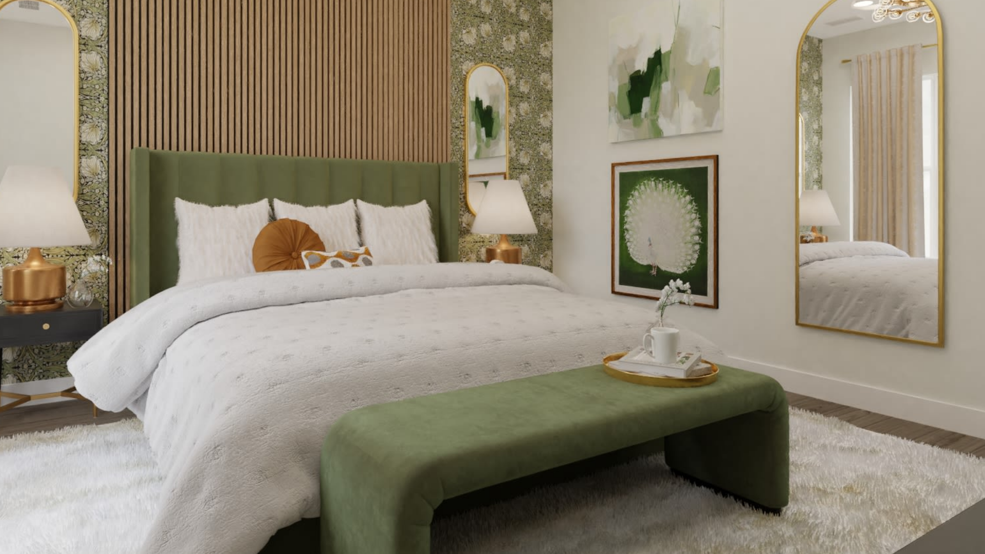 We created a cozy bedroom with botanical touches, green tones, gold accents, and soft textures. The floral wallpaper, velvet headboard, and gold-framed mirrors add character without being overwhelming. Every detail was thoughtfully designed to invite relaxation and photos.