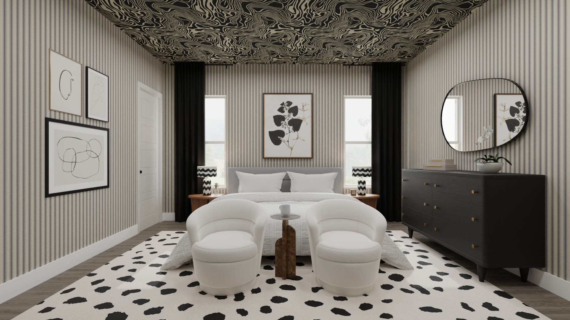 Valeria, a contemporary art lover, transformed her home in San Miguel de Allende into a boutique Airbnb brimming with character. She wanted one of the master bedrooms to feel like a modern gallery, yet retain its warmth. We designed a striking space with a mix of patterns, curved shapes, and a palette of black, white, and warm wood, perfect for photos and relaxation.
