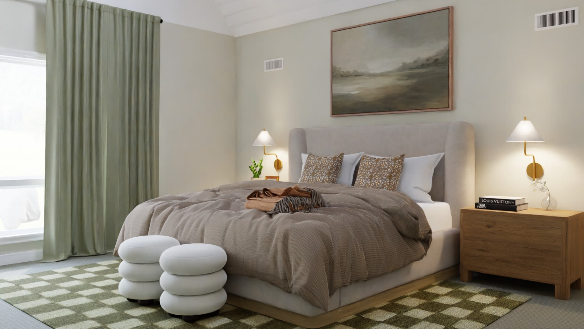 We created a space with earthy tones, soft textiles, and light wood details that convey calm. Olive green accents, landscape-inspired art, and soft lighting complete a relaxing atmosphere, perfect for disconnecting from everyday life and enjoying your home to the fullest.